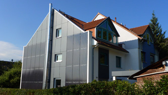 Das Solarenergie-Konzept wurde 2011 mit einer Solar-Fassade erweitert. Mit der Solar Fassade, die hier nach Osten ausgerichtet ist, werden mehrere Ziele gleichzeitig erreicht: